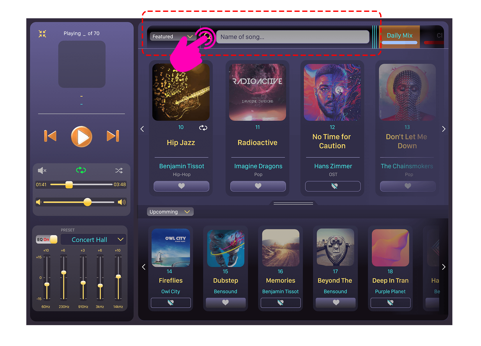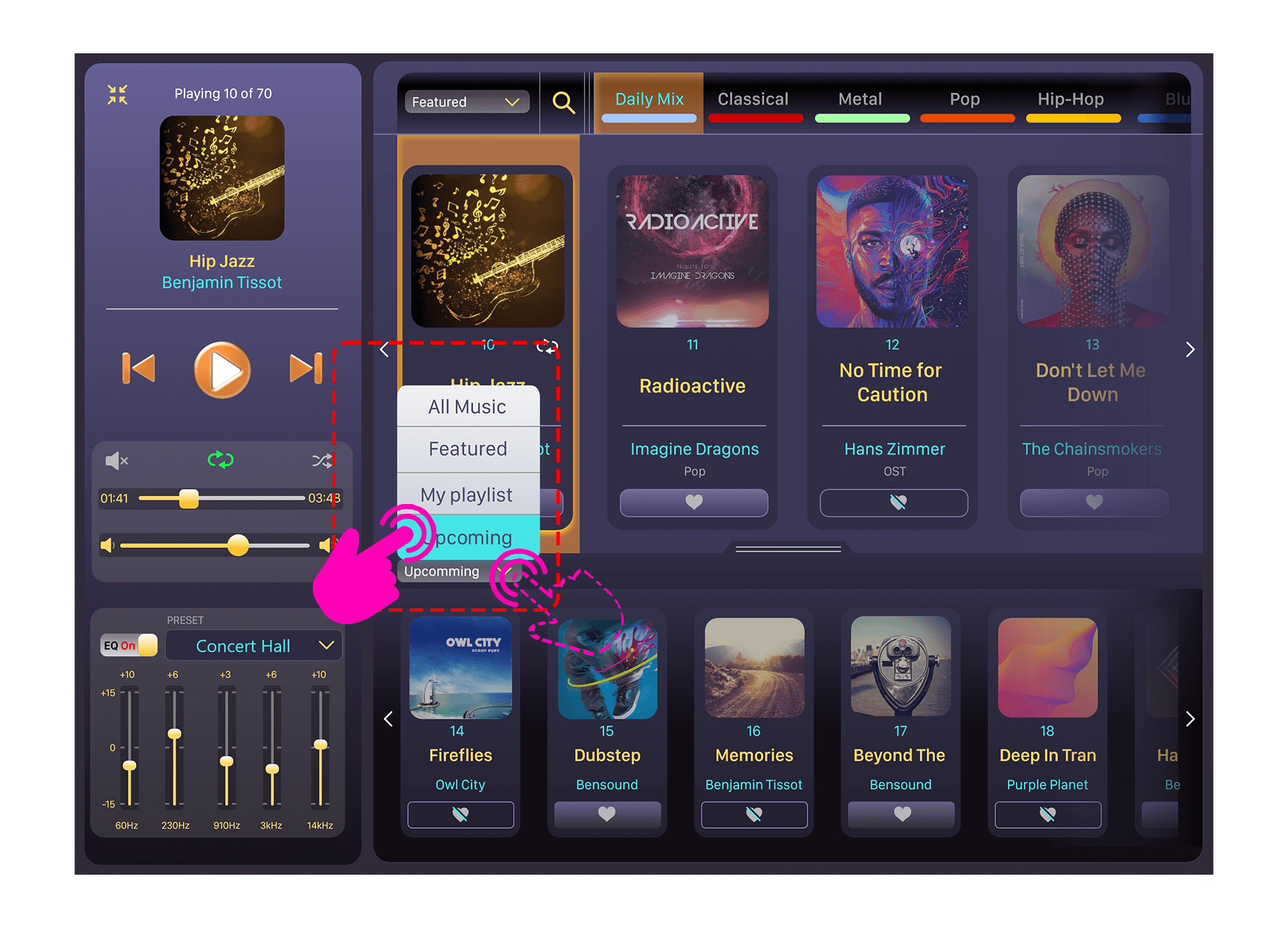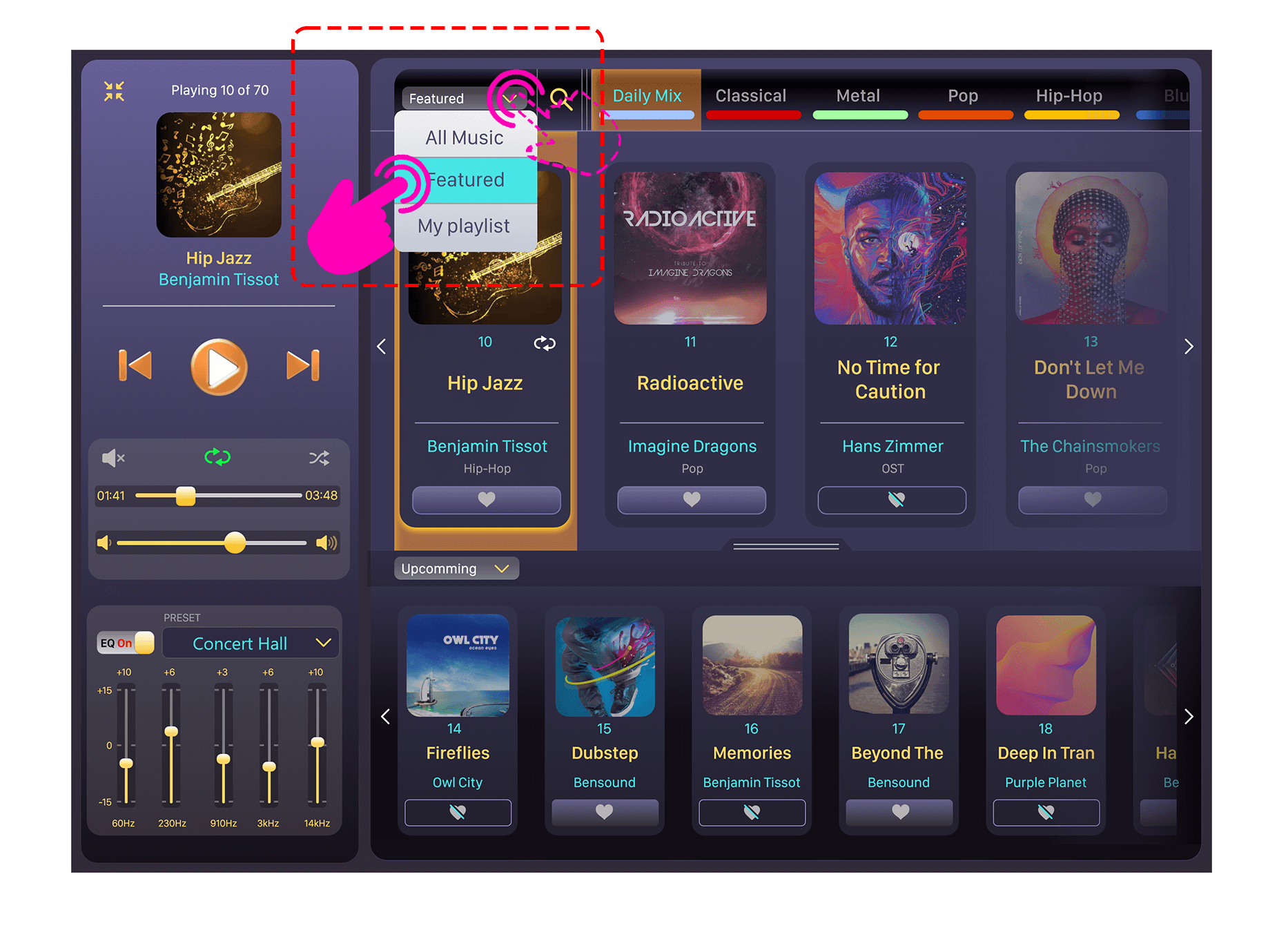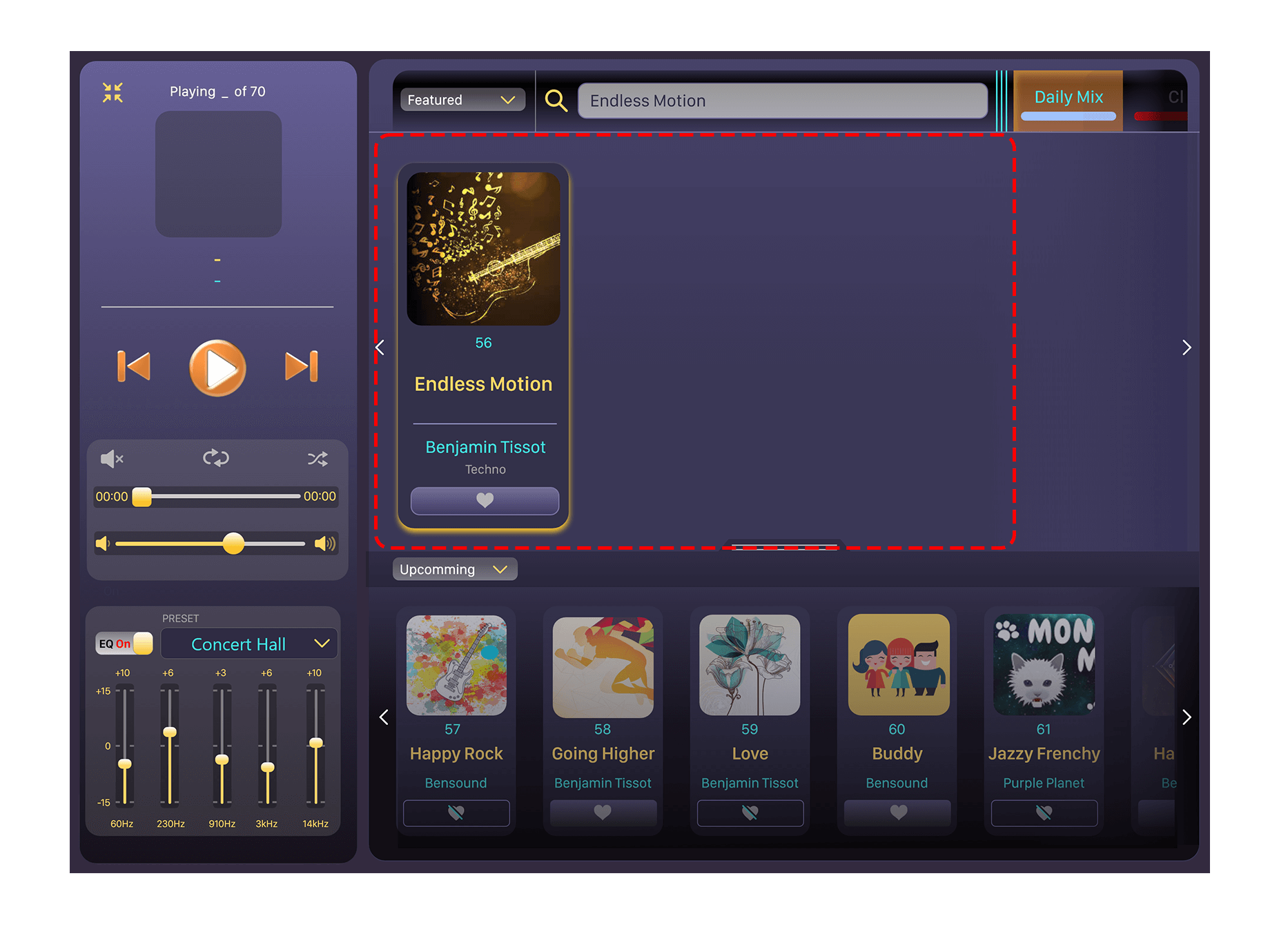 2. Lower section of the player populates the tracks/albums in with limited details and a smaller visual format than in comparison with the upper lists. A drop-down menu with options of ‘All Music’, ‘Featured’, ‘My Playlist’ and ‘Upcoming’ are provided as options to populate lower list (lower panel).