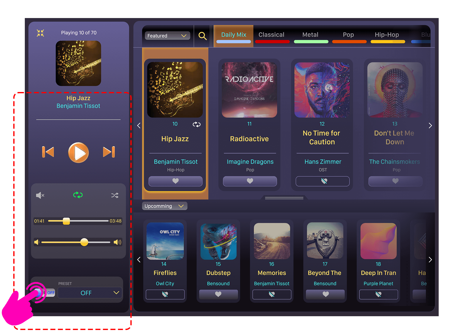 This chosen UI proposal's core principle is collapsibility. Except for the player controls and four music track information in the middle, the rest of the components may be minimised or hidden, eliminating visual clutter. (Further details of this UI’s operations and functions are explained in the high fidelity prototype section.)