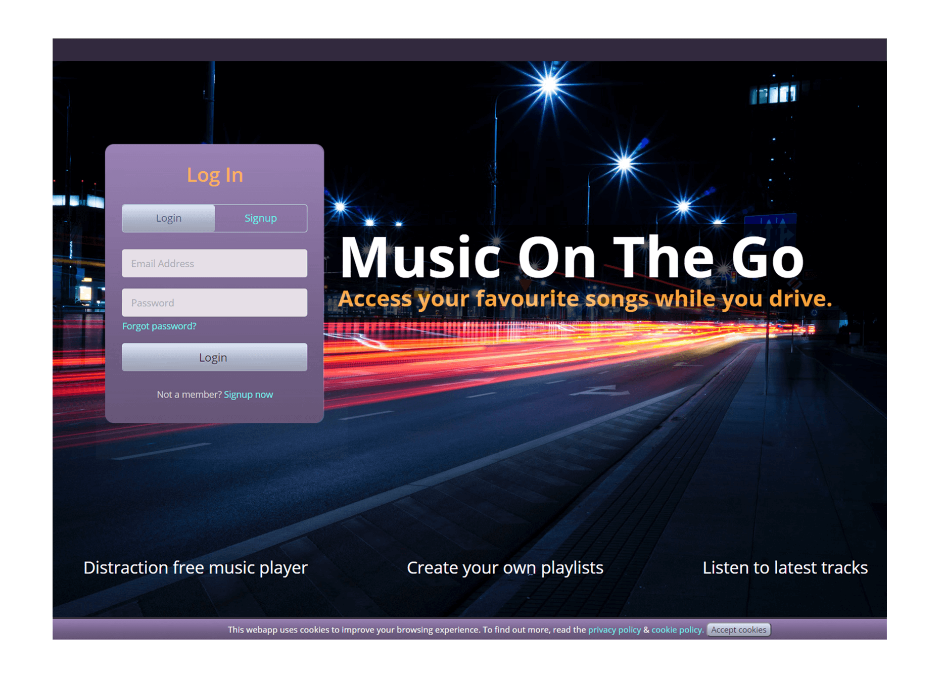 Log in: Use the auto-login or a personal login could be created by signing up. Playback: Tap/click on the album art of the required track. Search track: Type in a track name which is seen in the list. Additional feature added: Day-mode/Night-mode switching.