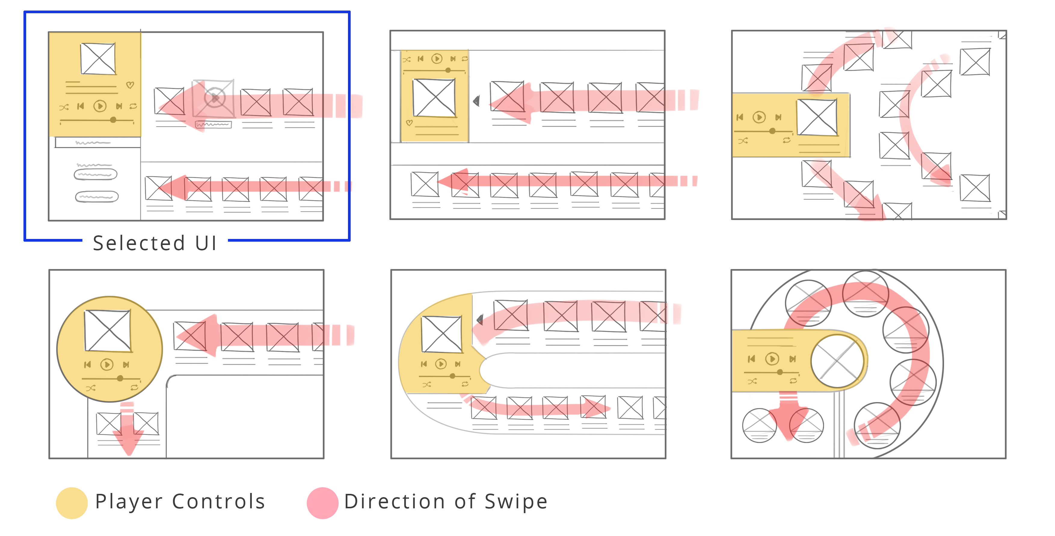 For each of these explorations, the music player’s controls are positioned at a conveniently reachable ‘green zone - A’ (explained earlier), while different designs for the player’s outline are tried. Besides that, there is an emphasis on ease of use when arranging the music tracks in various patterns across different iterations. The primary objective was to declutter the interface by increasing the amount of white space.